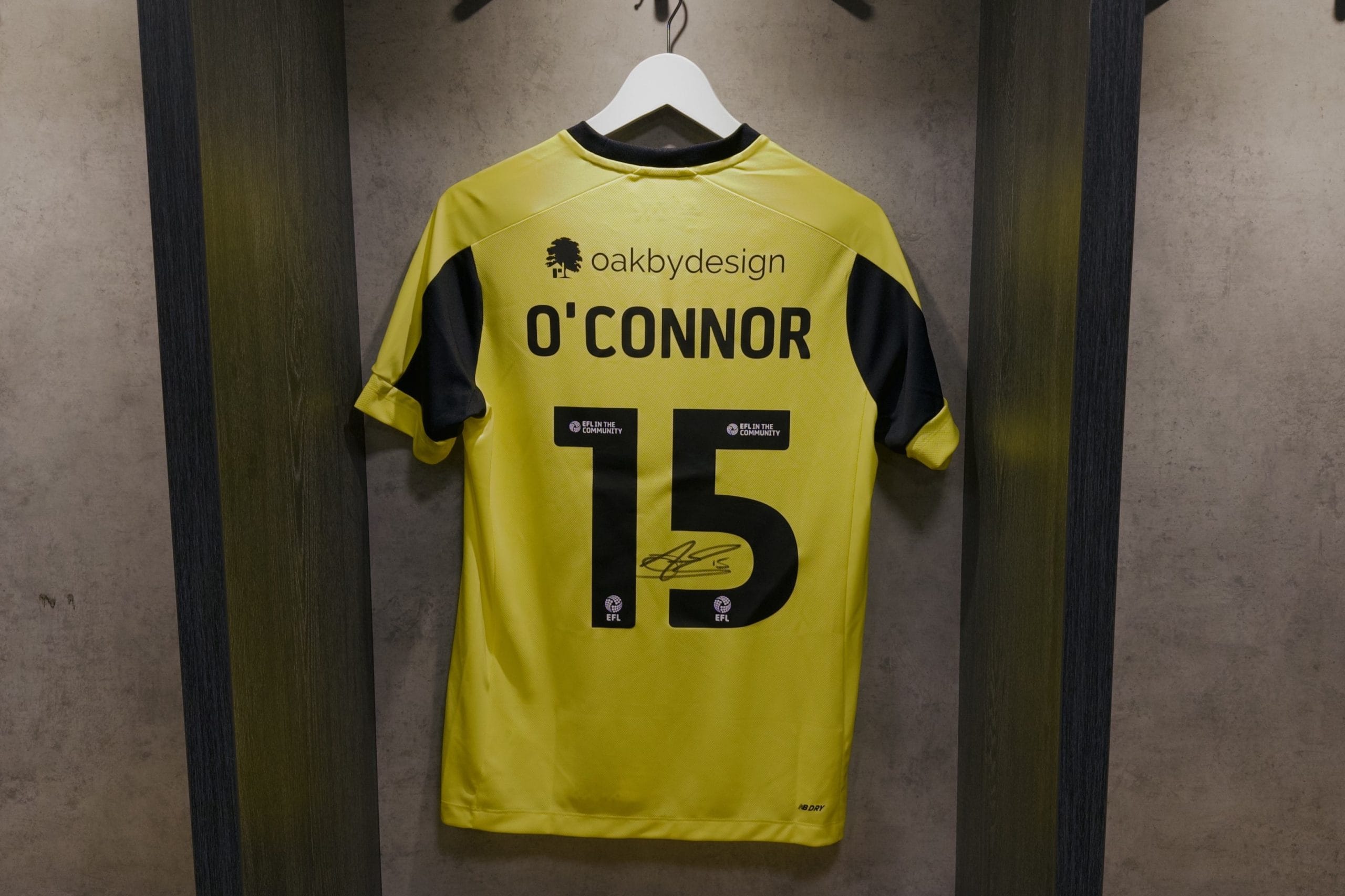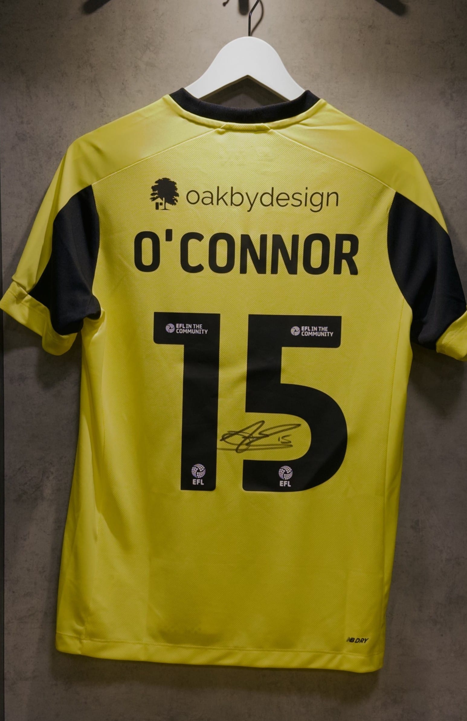 A 2025/26 Harrogate Town home shirt (size small), signed by defender Anthony O’Connor.
