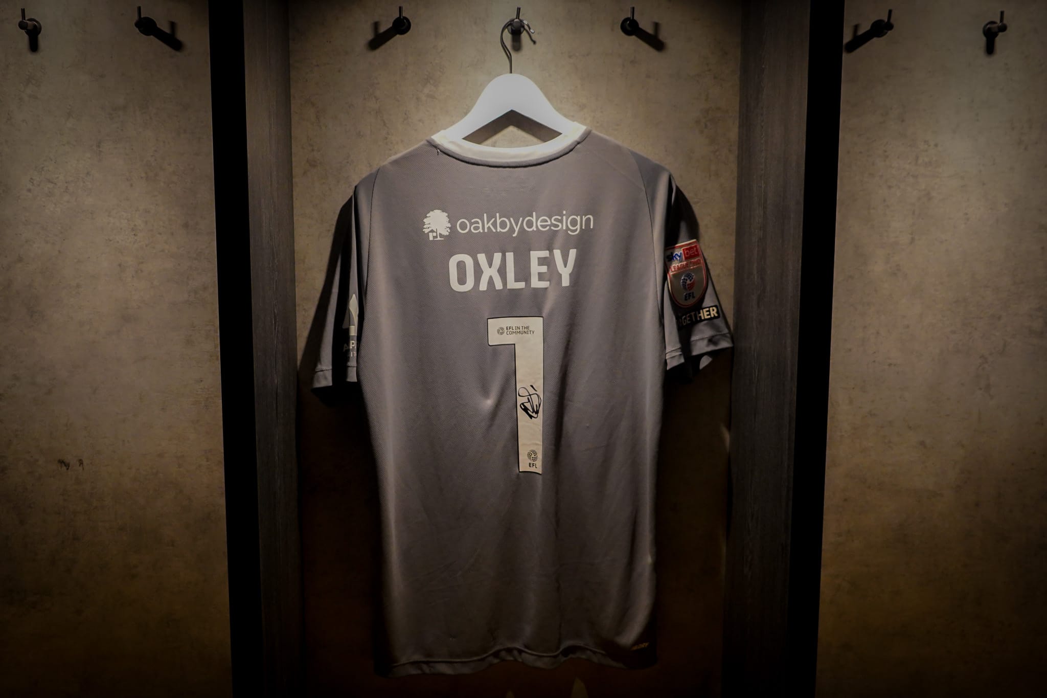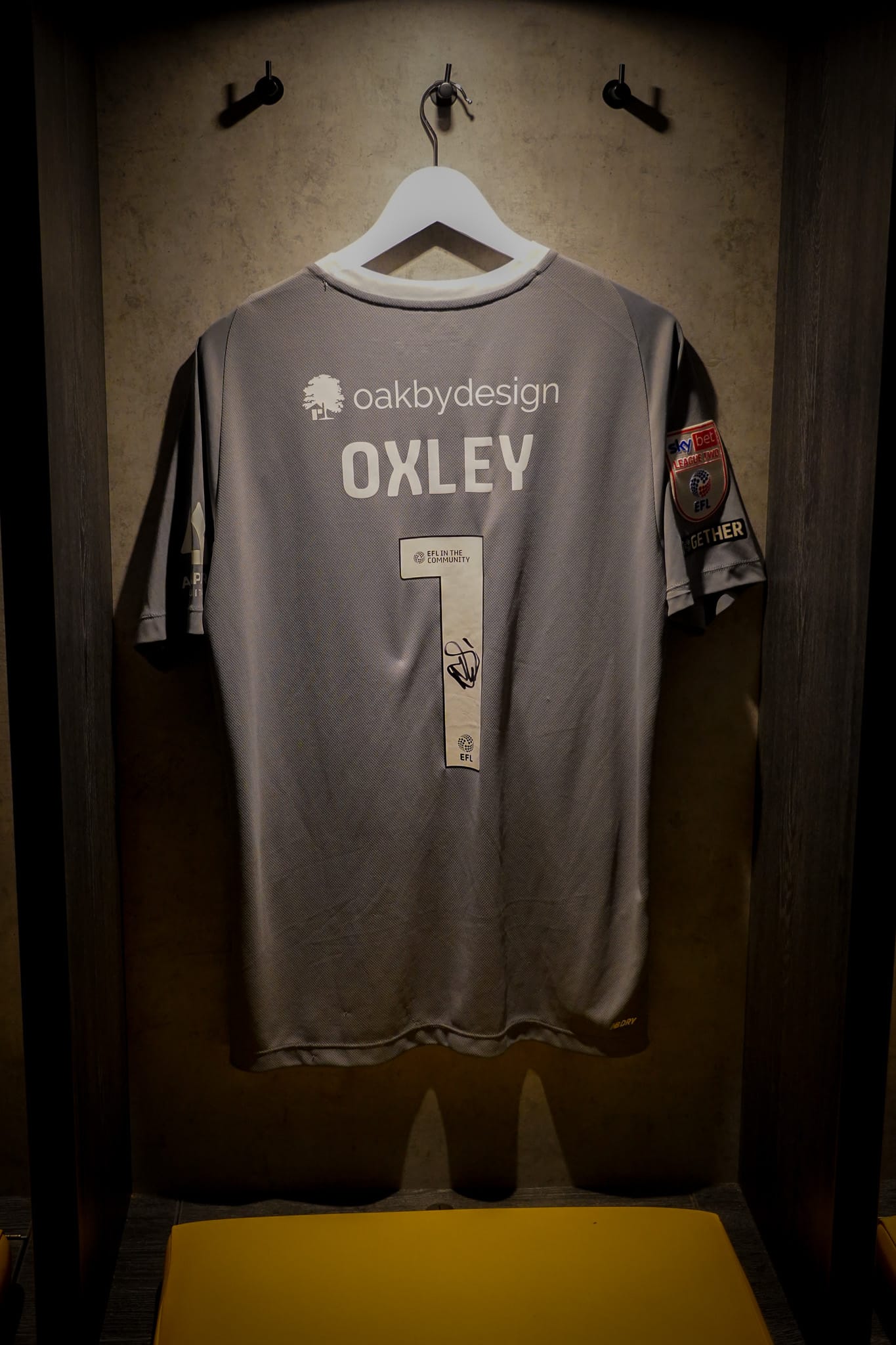 A match-issued 2024/25 Harrogate Town away goalkeeper shirt, signed by Mark Oxley.